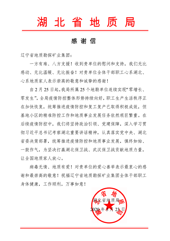 ——辽宁地矿集团收到湖北省地质局的感谢信